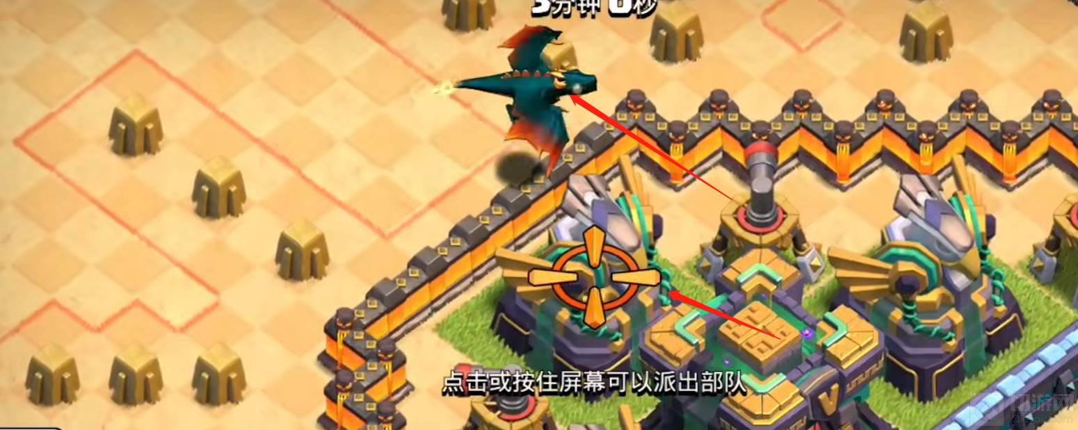 首先在左上角的城堡里放一个火龙进攻就可以。