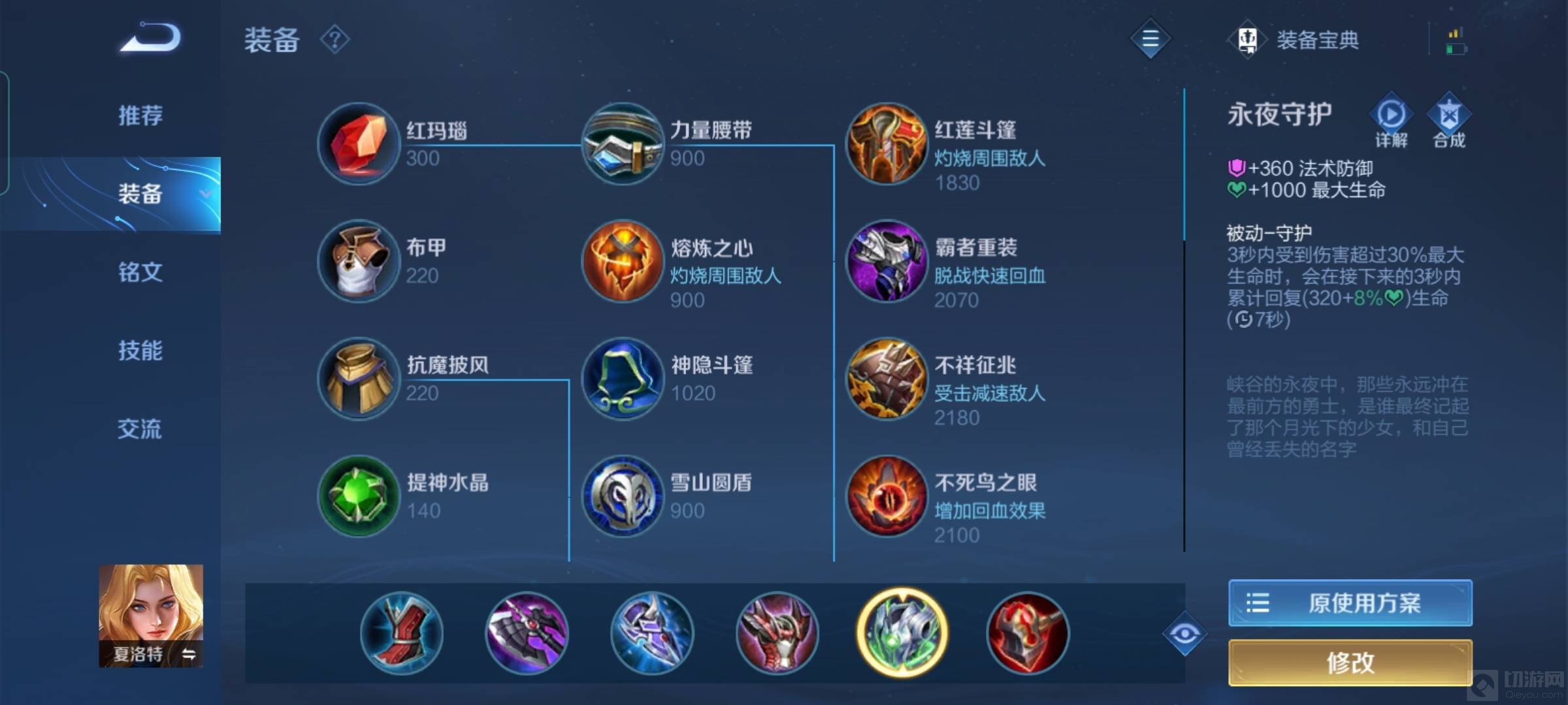 1、出装:冷静之靴+暗影战斧+冰脉护手+反伤刺甲+永夜守护;