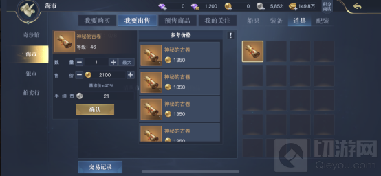 6、海市是游戏里玩家可以自由贸易的地方,也是我们可以淘到稀有物品的最佳之地,比如传奇造船的材料、精工、装备、魂石和各类奇珍异宝等等。在这里贸易需要使用金币,金币不足则无法购买自己需要的物品。金币的获取方面可以通过出售稀有物品来获得,我们可以将背包里使用不到的稀有物品,在海市进行售卖。在不着急售出的情况下,价格可以设置略高一些,不用刻意压价,这样可以保证我们最大程度获取金币。