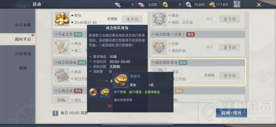 4、接下来是分支舰队,这里可以持续获取贸易币收益,是我们前期一定要创建的玩法。最后是商会组队贸易和商会投资战,这两个活动在商会活动的限时开启里,开启时间分别是周二和周日,小伙伴们可别错过时间,否则贸易币不一定够中后期消耗的。