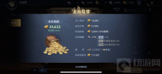 3、在获取方面,上线首先看看有没有触发行情,这个属于特殊物品贸易,可以获取大量的贸易币。其次是每日流行物品,中午十二点准时刷新,在这个期间贸易不增加疲劳值,而且收益十分可观,是每天必做。接下来每日贸易必须要完成,可以通过地图—交易所,找到交易所的老板,购买物品。购买物品需要注意,优先选择星数高的,星数越高越稀有,可赚取的贸易币也就越多。随后点开世界地图,查看不同区域货物的价格,对比一下价格的高低,选择最高价格的地区,将所购买的货物进行出售,来赚取高额贸易币。