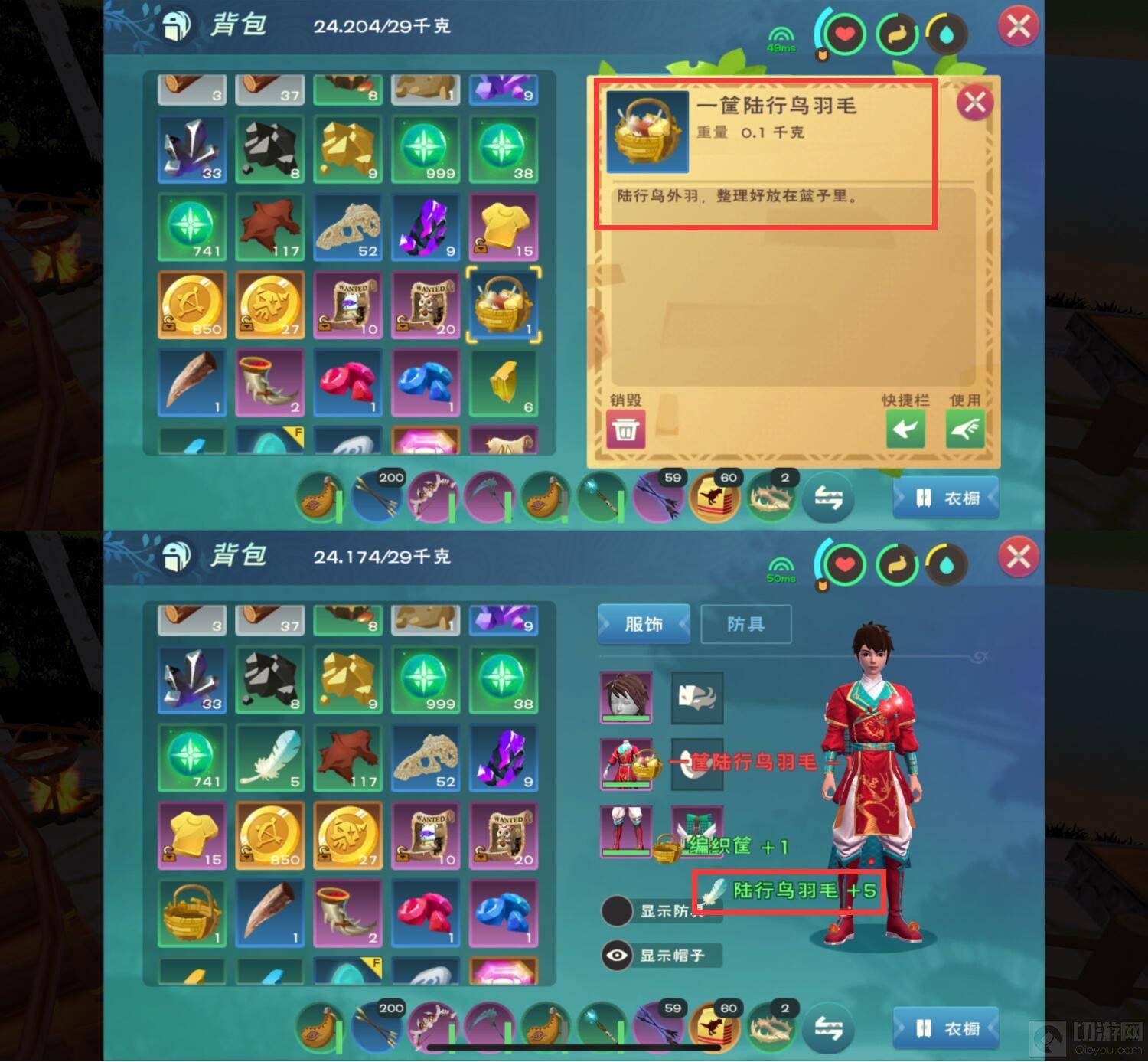 3、收取一筐陆行鸟羽毛后,在背包里可以将他使用,一筐陆行鸟羽毛里面有5个羽毛,一筐鸡蛋也是5个,一筐羊毛也是5个,一框牛奶也是5个,简单来说就是带有功能性的家园宠物才有用,其他家园宠物就只能起到观赛作用了。