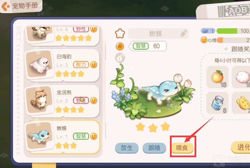 2、也可在宠物手册中选择单独的宠物,点击喂食。