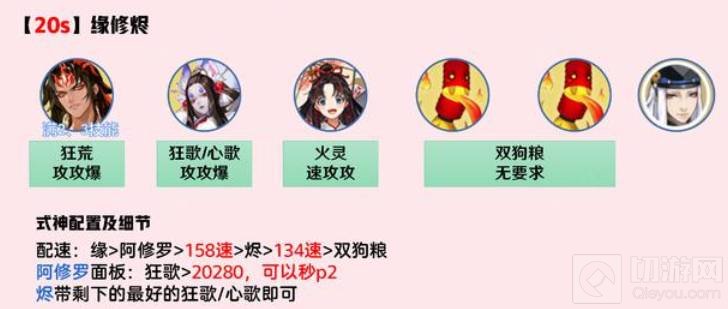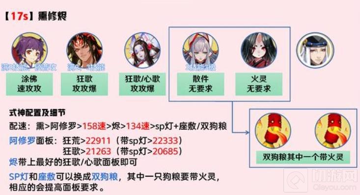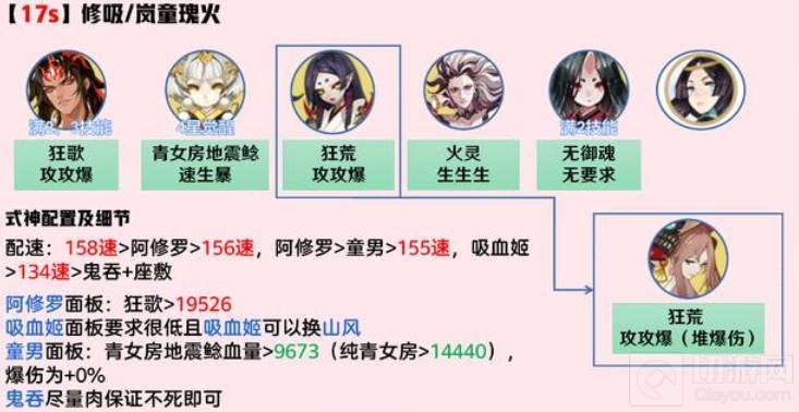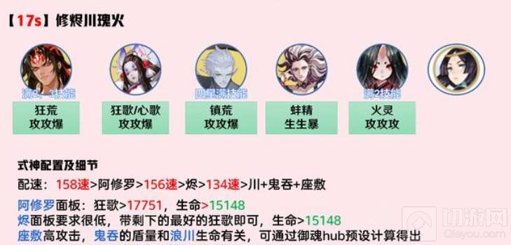 阴阳师阿修罗魂土最低配置如果配速17s,最低配置可以选择第一套魂土,如果追求配速,可以选择第六套也就是20s缘修烬的搭配。