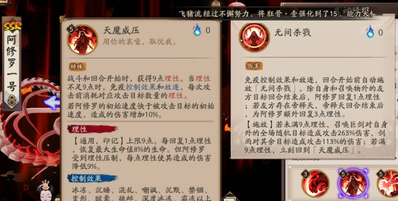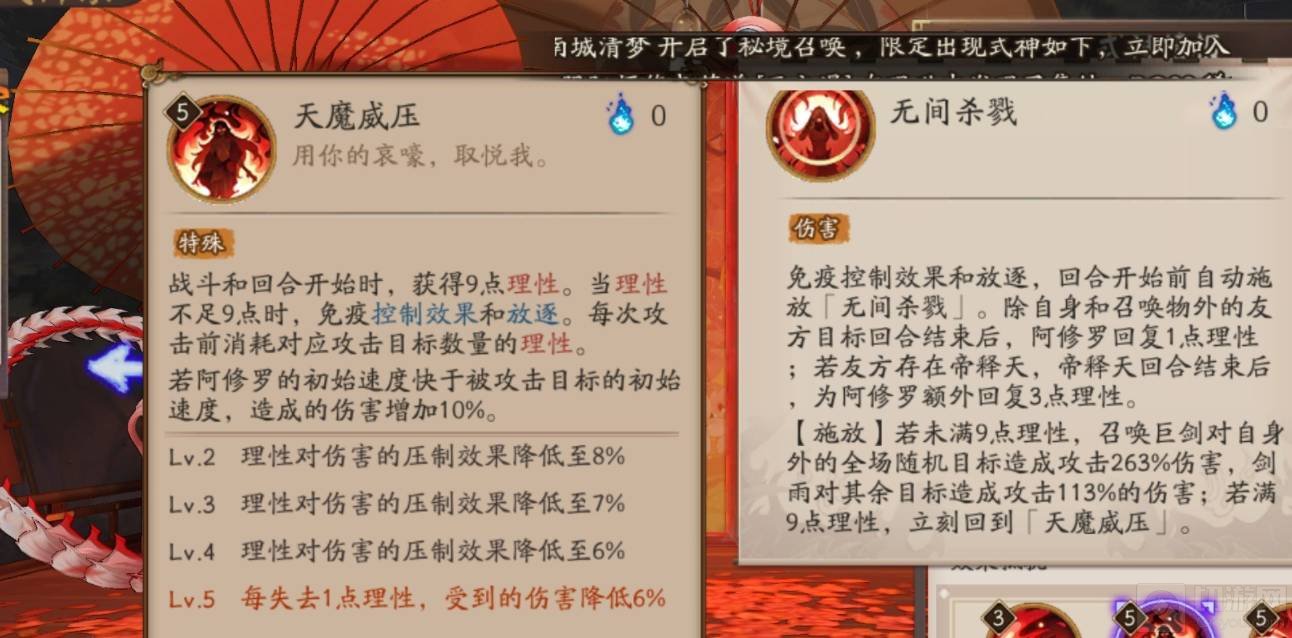 阿修罗有个理性机制,战斗开始和回合开始时,获得9点理性(最高9点)。攻击目标会消耗理性值,攻击前消耗对应攻击目标数量的理性值。当阿修罗理性值不足9点时,免疫控制效果和放逐。‘免控机制’,理性值会压制伤害,理性值越高,阿修罗伤害压制越多,升级2技能能减少压制效果。阿修罗的初始速度高于被攻击目标的初始速度,造成的伤害增加10%,无间杀戮状态下,友方单位回合结束后会恢复1点理性值(帝释天额外回复3点),每恢复1点理性值,阿修罗会恢复8%的最大生命值。‘恢复理性值同时会回血,不受减疗效果影响’,无间杀戮状态,阿修罗无法手动控制施法,系统自动施法。随机攻击全场目标(包含:友方队友),攻击目标伤害为263%,再对全体剑雨伤害113%,也就是说被随机选中的目标伤害为:263% 113%=376%,被随机到大概率死翘翘了,在「天魔威压」状态下,可以理解为就是个被动技能,只能选择用1技能或3技能。
