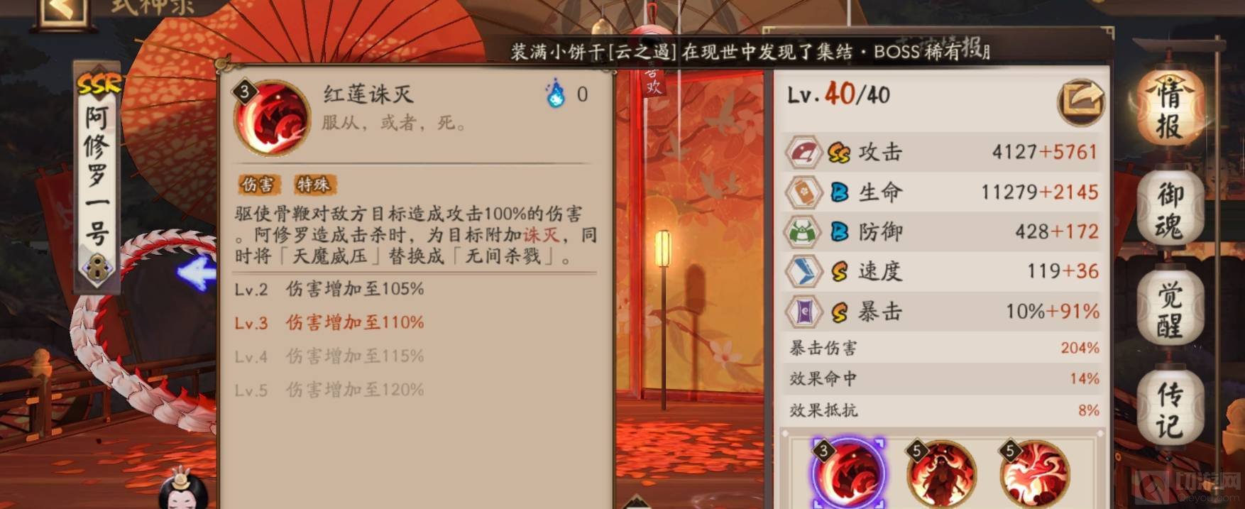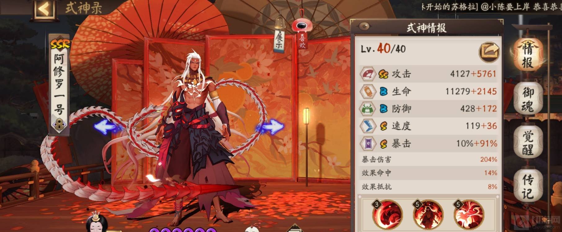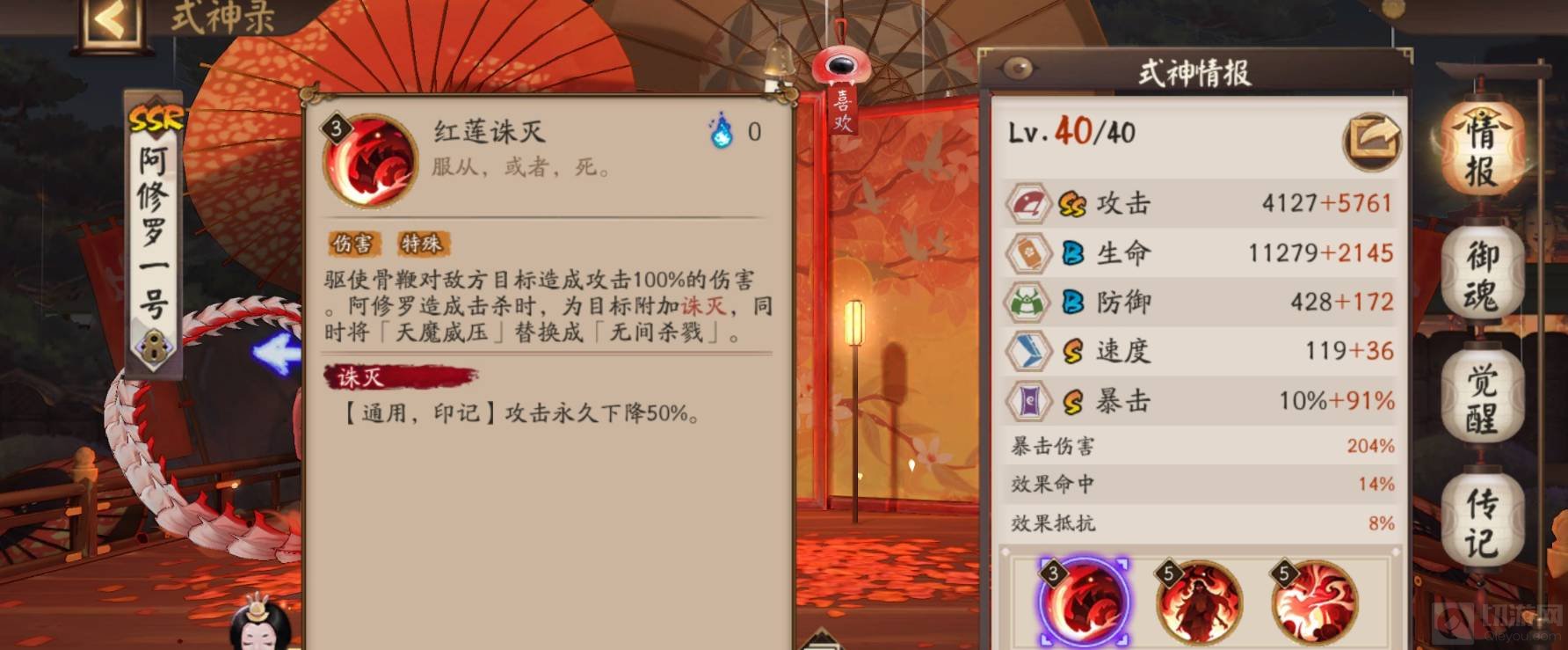 第二个双S攻击力的式神,攻击力4127比同为SS的八岐大蛇4074还要高53点,阿修罗速度119和面灵气的速度一致。阎魔118,镰鼬117,不知火117,鹿丸115,姑姑115,这样对比下来,阿修罗的面板属性确实是相对高的。