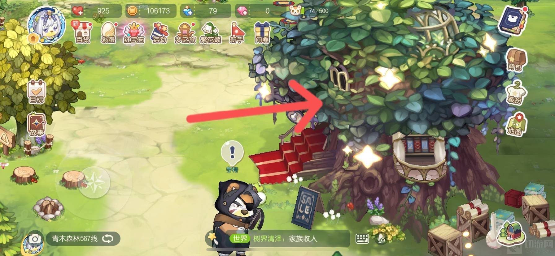 1、挖宝树屋的位置位于青木森林,具体位置位于‘青木森林’地图的右侧,来到青木森林后一直往右边走,就能看到这个树屋一样的建筑了,靠近后便能与之交互进去兑换装扮。
