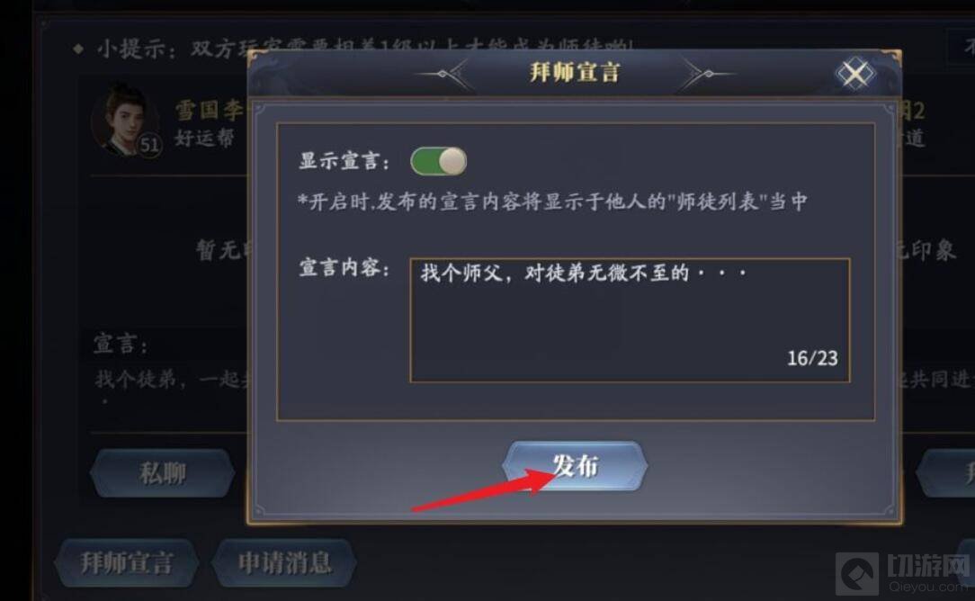 5,选择好师傅后发布拜师宣言,等待师傅同意即可。