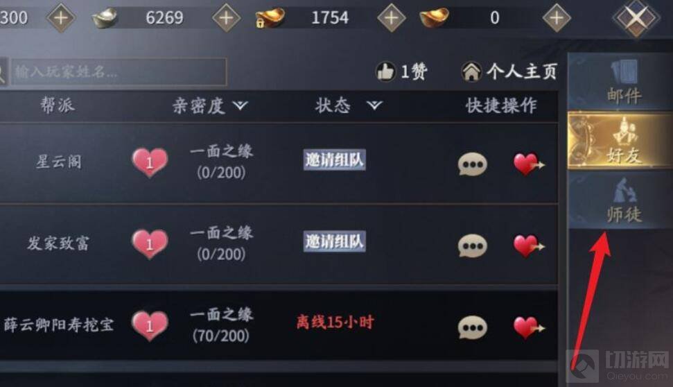 2,然后进入亲友界面,点击‘师徒’选项。