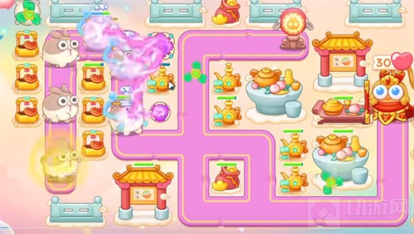 5、后面会出现冰冻兔,在赛道下方的位置可以建造两个火瓶,帮助解冻,在靠近兔子出口的地方各建造一个毒针,帮助破防。