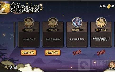 2.后面解锁的独臂学员鸣人、写轮眼佐助和学员小樱分别可以通过两个半本强者秘籍进化成自来也、大蛇丸和纲手,这也恰好对应了木叶三忍的设定。少卡可以在宝箱开出暗卡、新春卡卡西和万元卡卡西,通过两个半本秘籍可以进化成神威卡卡西。