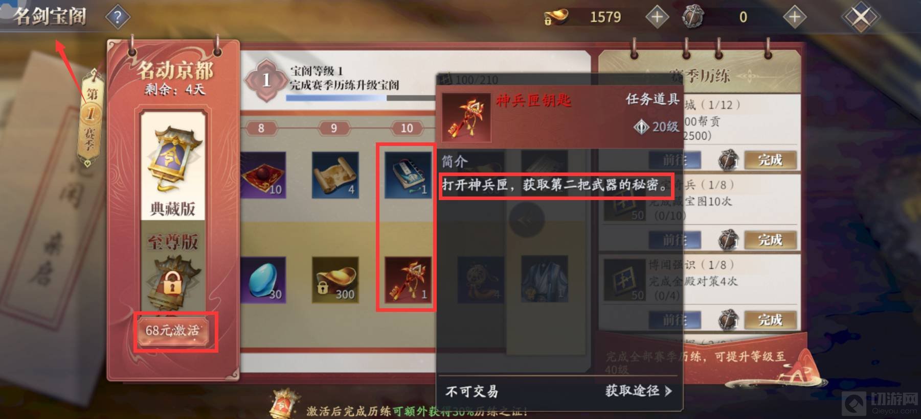 神兵匣钥匙需要花费68元购买至尊版名剑宝阁升级到10级领取,神兵匣钥匙的作用为打开神兵匣,开启第二把武器。