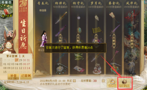 少侠可以点击蛋糕或打开任务栏进入生日祈愿界面,在活动期间通过签到、网页送祝福活动、周年庆祥瑞笔录活动、新服专属活动来获得祈愿值。