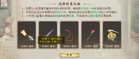 在各个档次的礼品中,少侠都可查看到每种礼物发放的数量,单服的神兵奖励就足足有30把之多,更有一阶仙器数百件、海量珍稀道具等……在最终开奖之前,少侠都可随时更换选择,重置祈愿结果,祝大家几率不断,带走心意礼物!
