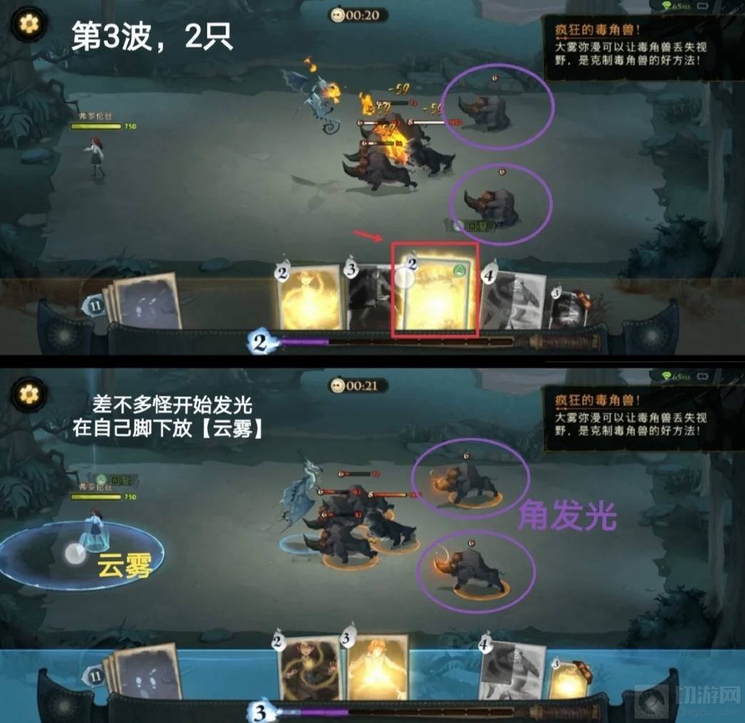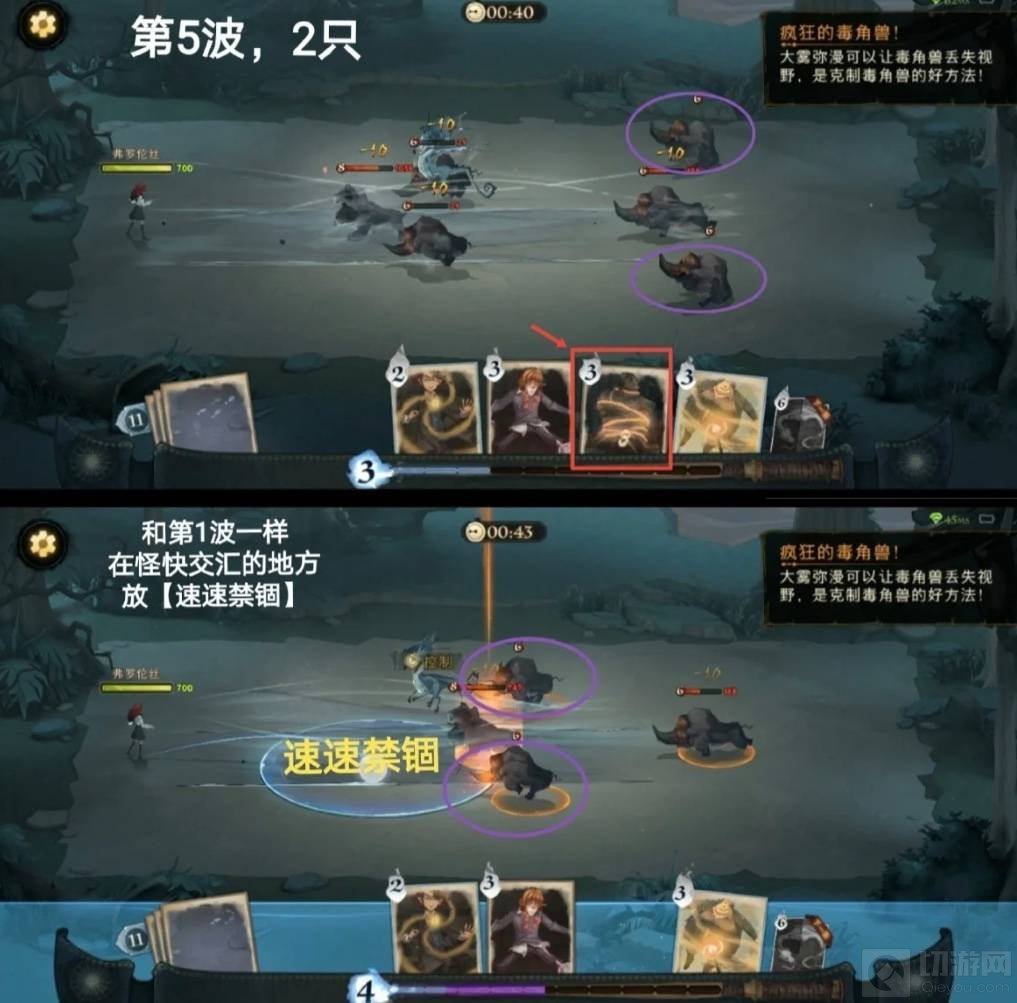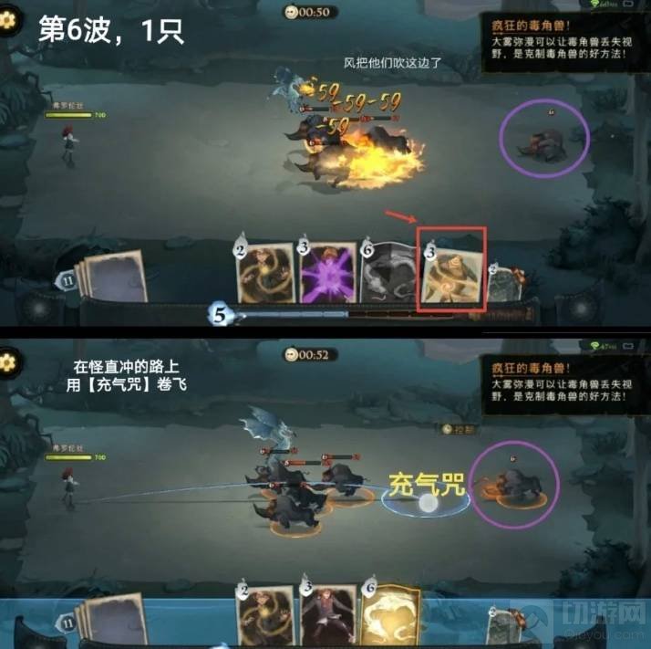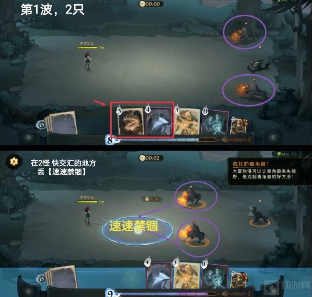 1、开局注意,当毒角兽角开始发光,就可以立马使用卡牌了。首先第1波有2只,角发光,预判交汇点,用速速禁锢锁住,紧接飓风咒吹开。