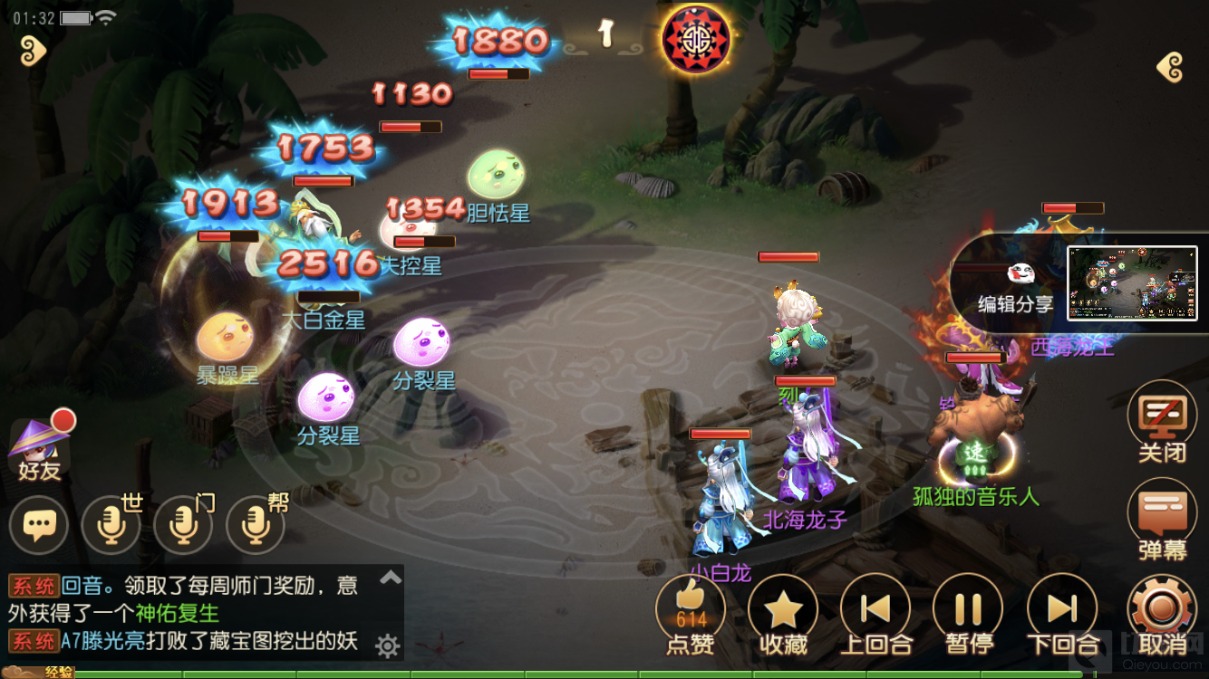 2.太白金星没有阵法,所以在阵法的选择的上,只需要追求伤害的最大化即可,助战推荐全部带上法系群秒助战。蜃境寻宝中有增加法爆,法连的技能一定要多学,这是一回合击败太白金星的关键所在!助战推荐红孩儿,北海龙子,铁扇公主等输出能力高的助战!