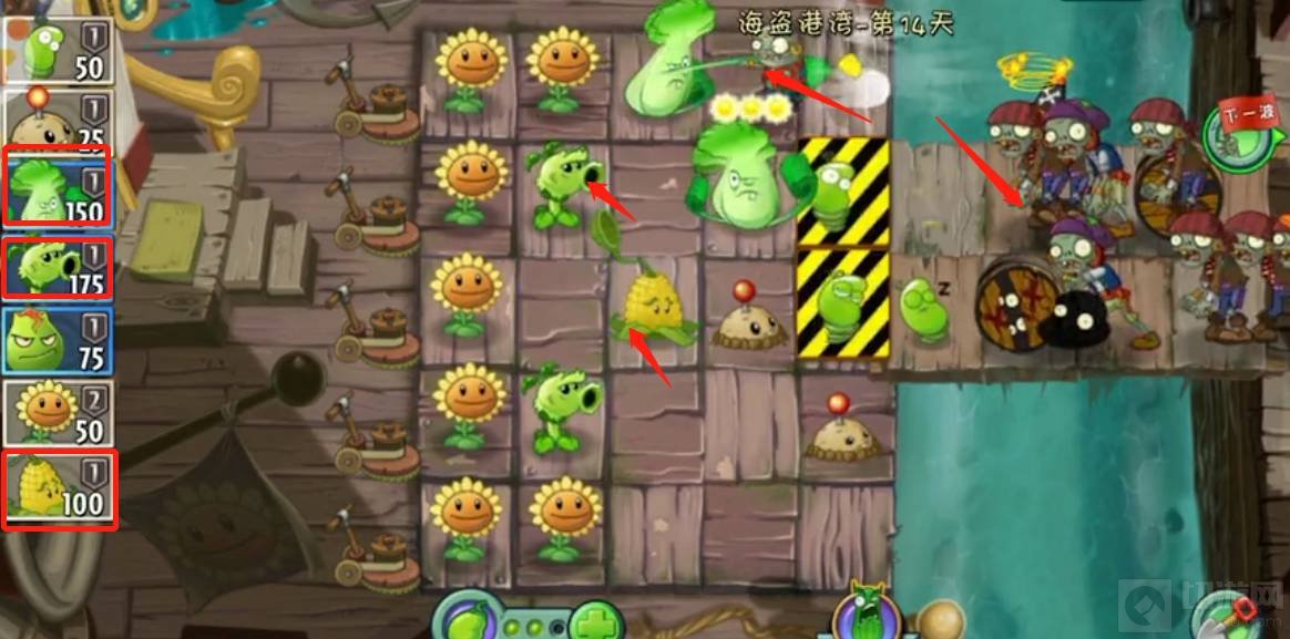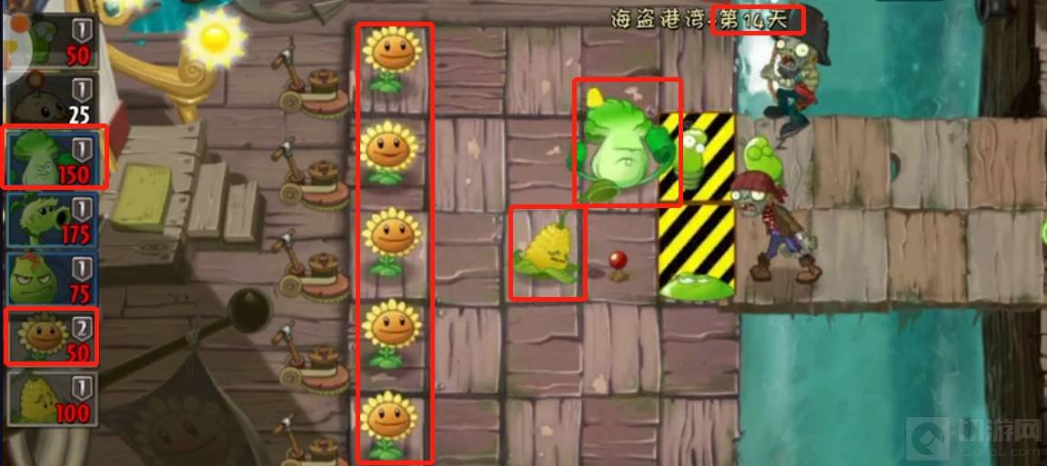 1.首先点击挑战第14关,然后在最后的甲板种上向日癸,因为向日癸可以提供太阳能量豆可以快速种植别的植物,然后接着种植第三个植物放在前面攻击僵尸,刚有足够的太阳能量豆接着在第三排甲板上种植玉米投手,就这样一直循环种并且攻击前面几波僵尸即可。