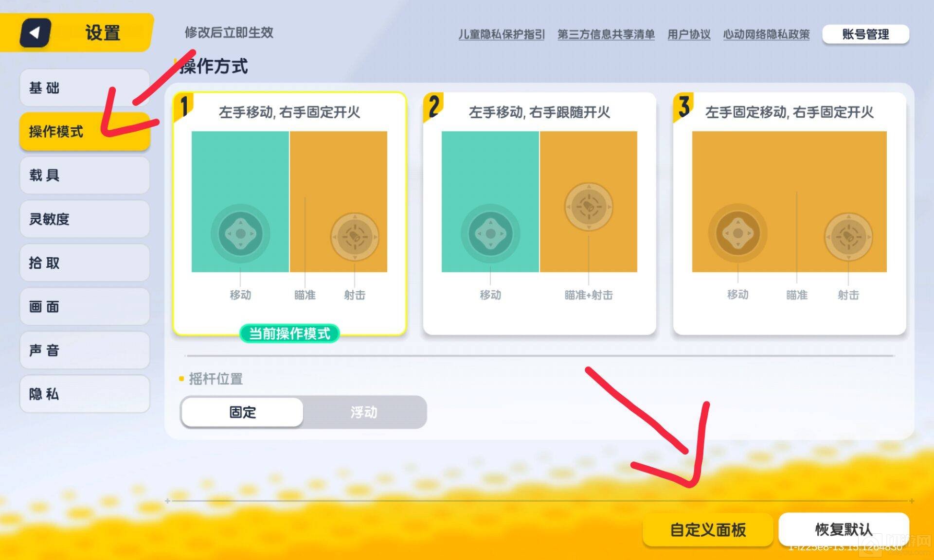 2.设置页面左侧栏选择操作模式,然后点击右下角的自定义面板。