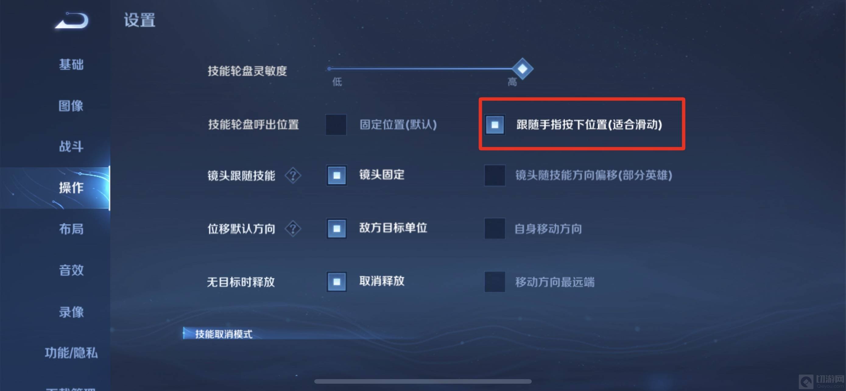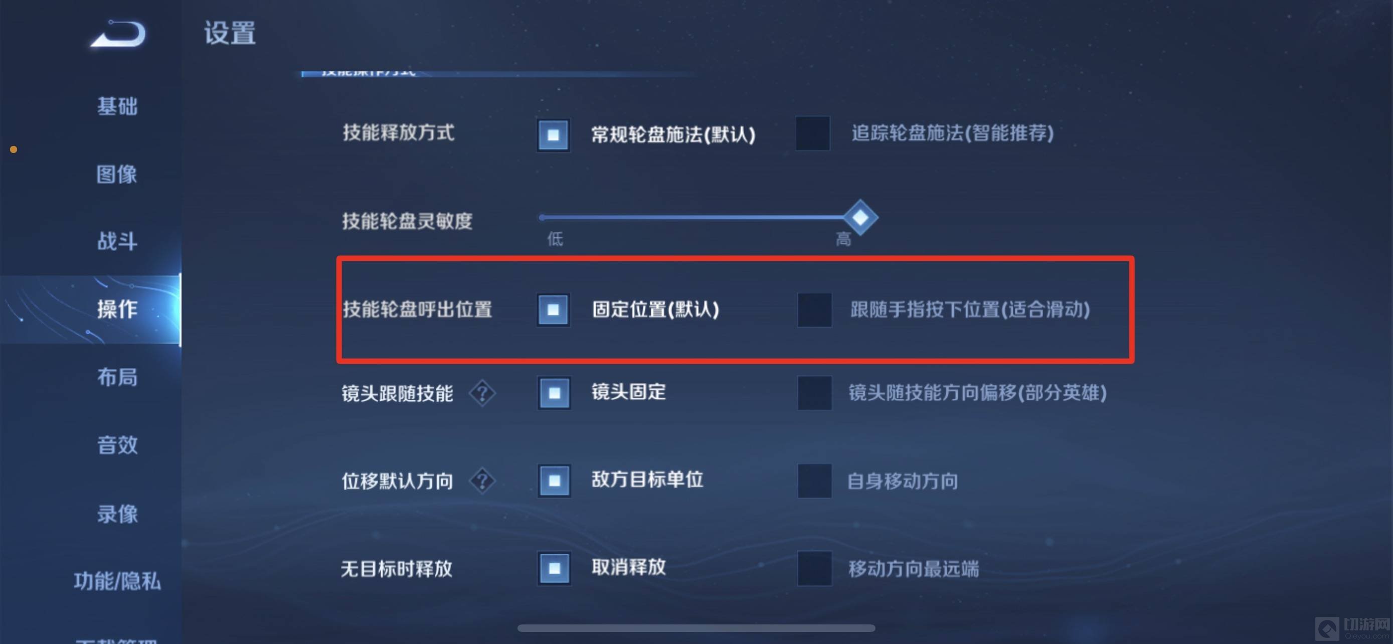 3.接着滑动屏幕右侧将操作具体设置向下拉,找到技能轮盘呼出位置一栏。