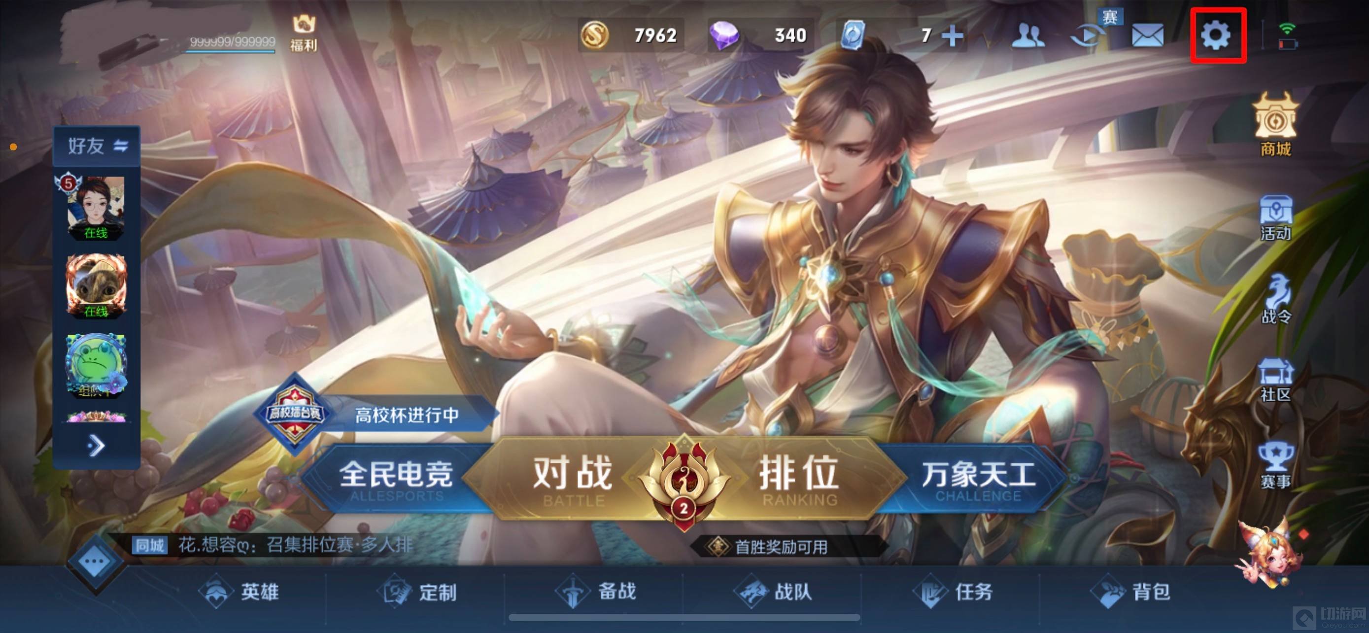 1.先进入大厅,点击右上角齿轮图标,进入设置界面。
