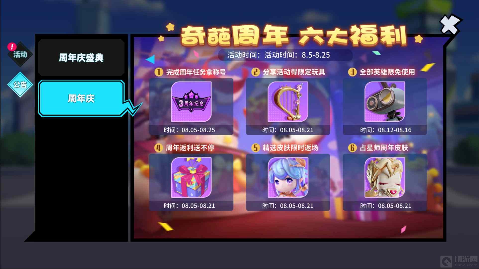 不仅有周年称号登录即送,还有活动限定玩具,全英雄限免等多种福利等待战斗家们的青睐!