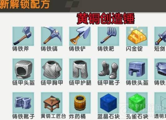 3. 将手里的工具切换成黄铜创造锤并使用即可解锁铸铁创造锤,以及相关的矿产,生产工具和武器装备的配方。注意:解锁黄铜创造锤后也可解锁新版本的防火背包和氧气面罩的配方。