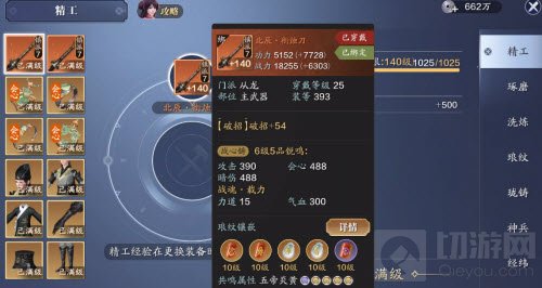 2、装备打造:今天可以进阶最后一个装备副武器,总共可以提升【323*1.35(琢磨)+82(精工)】=518点功力。