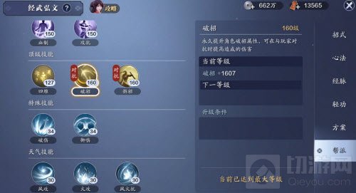 3、经武弘文:120级开放高级技能血制140~150级。总共需要7W帮贡和2594W的碎银,提供248点功力。另外顶级技能开放159~160级,四维需要39720帮贡,破招需要16000帮贡和1632W碎银,拆招需要16000帮贡和1088W碎银,提供142点功力,破拆总共提供1607点。最后天气技能风攻,火攻,风火抗开放25~30级,需要5200点帮贡提升,提升400点功力。