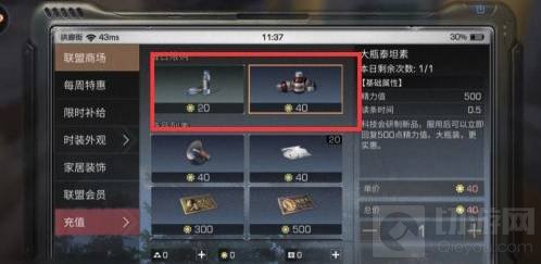 2. 精力值也可以自然恢复,随着时间恢复,每10分钟会回复30点精力值,也可以通过充值得到的信用点在商城购买泰坦素来获得额外的精力值,大瓶的可以恢复500点,小瓶的可以恢复200点。