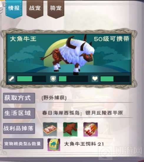 1、大角牛王是一个比较值得捕捉和饲养的坐骑宠物,50级才能够抓捕。