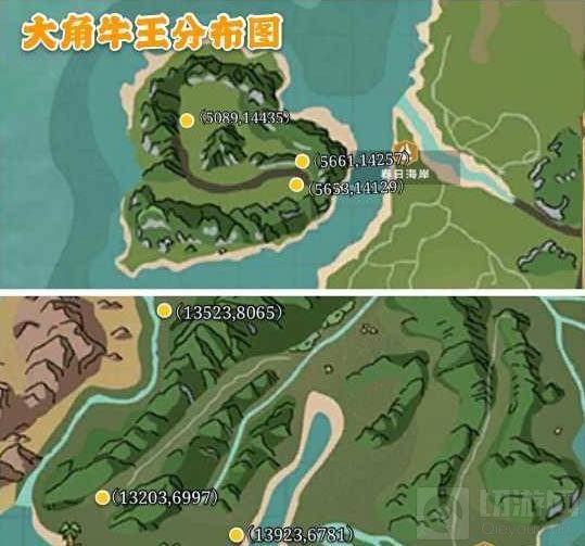 2、大角牛王主要分布在春日海岸西孤岛,和银月丘陵西岸的往生谷、暖风谷一带,具体位置如图所示。