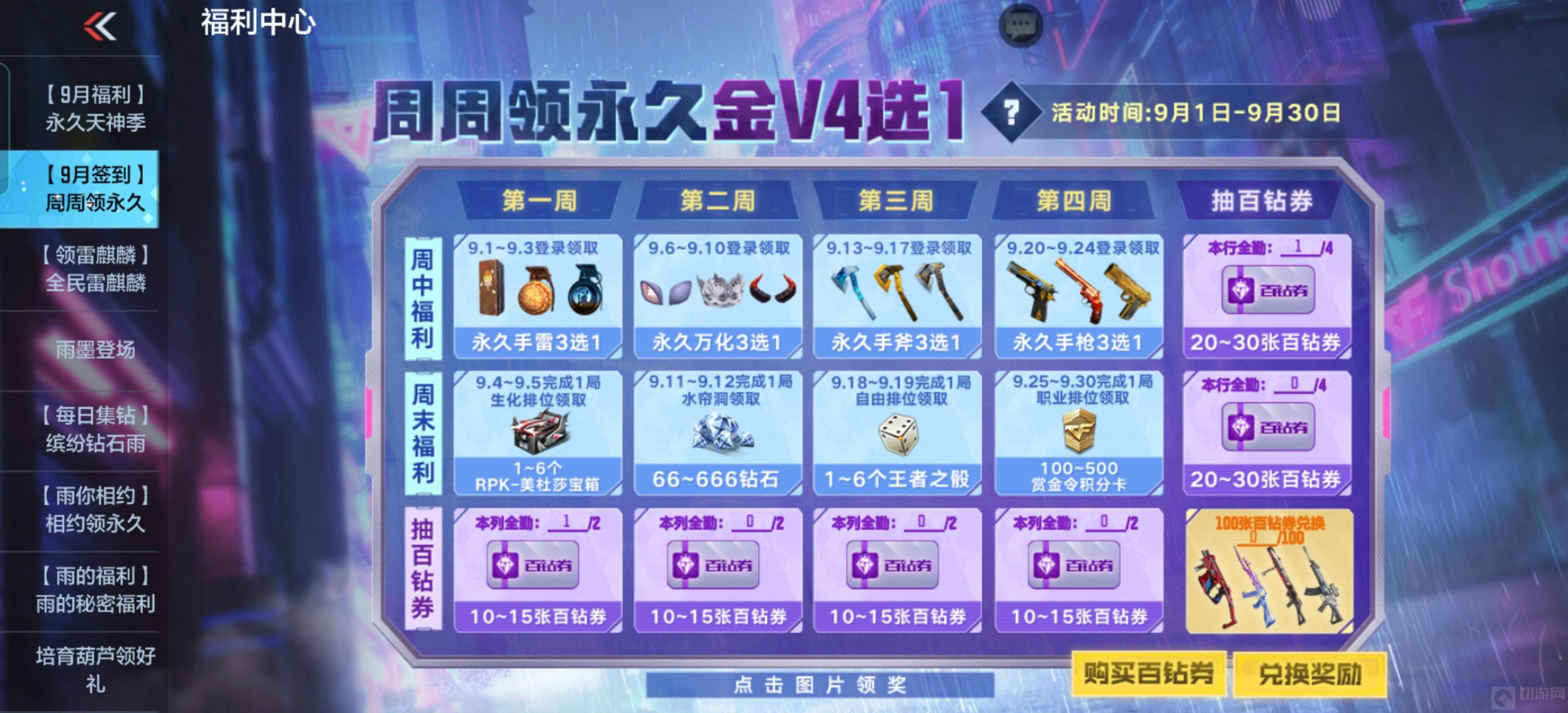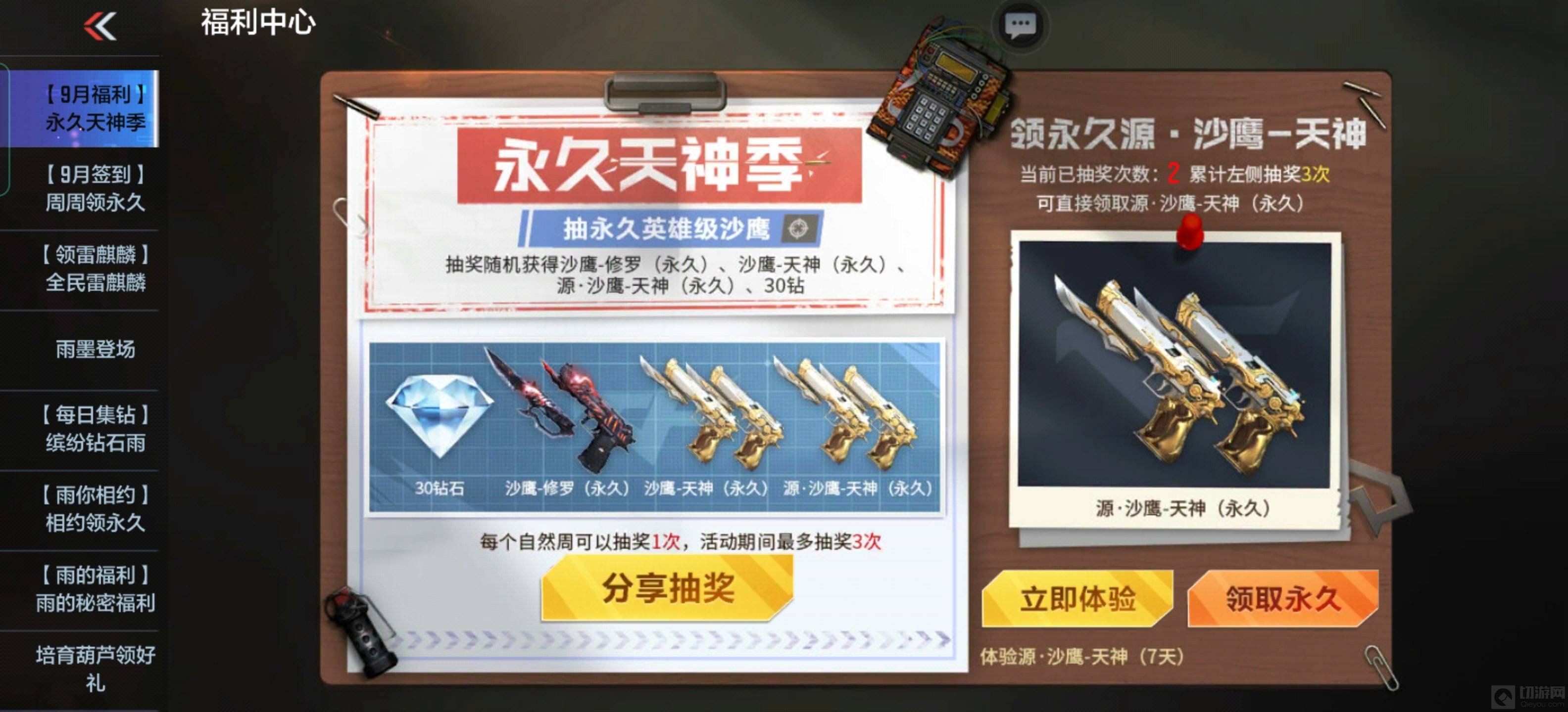 3、找到9月福利永久天神季点击进入获得有两种方法一种每周分享抽奖一次抽满三次即可领取永久源沙鹰,第二种就是各位玩家的运气号一次抽奖直接抽中。