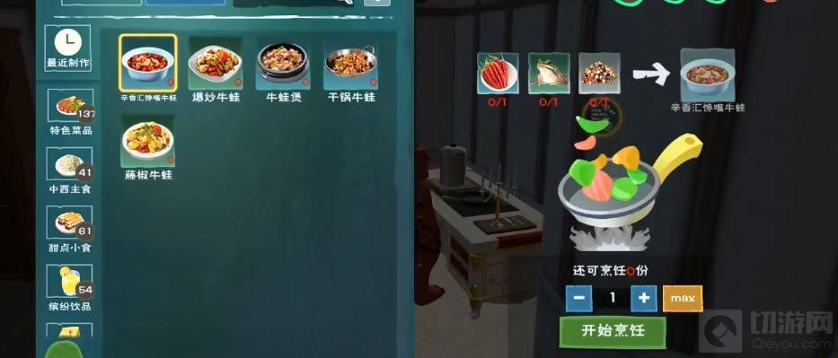 二、配方:青椒 洋葱 牛蛙可以获得爆炒牛蛙( 70食物);朝天椒 胡椒 牛蛙可以获得辛香汇水煮牛蛙( 105食物,一级御寒buff);胡椒 柠檬 牛蛙可以获得藤椒牛蛙( 70食物)。