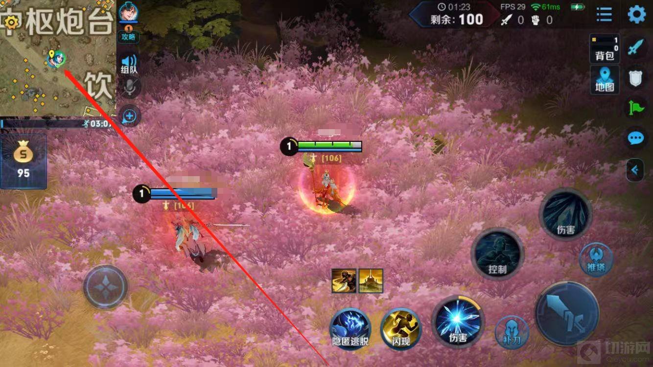 2,在游戏对局内打开左上角的小地图,花海的位置就在中枢炮台跟饮马池之间。