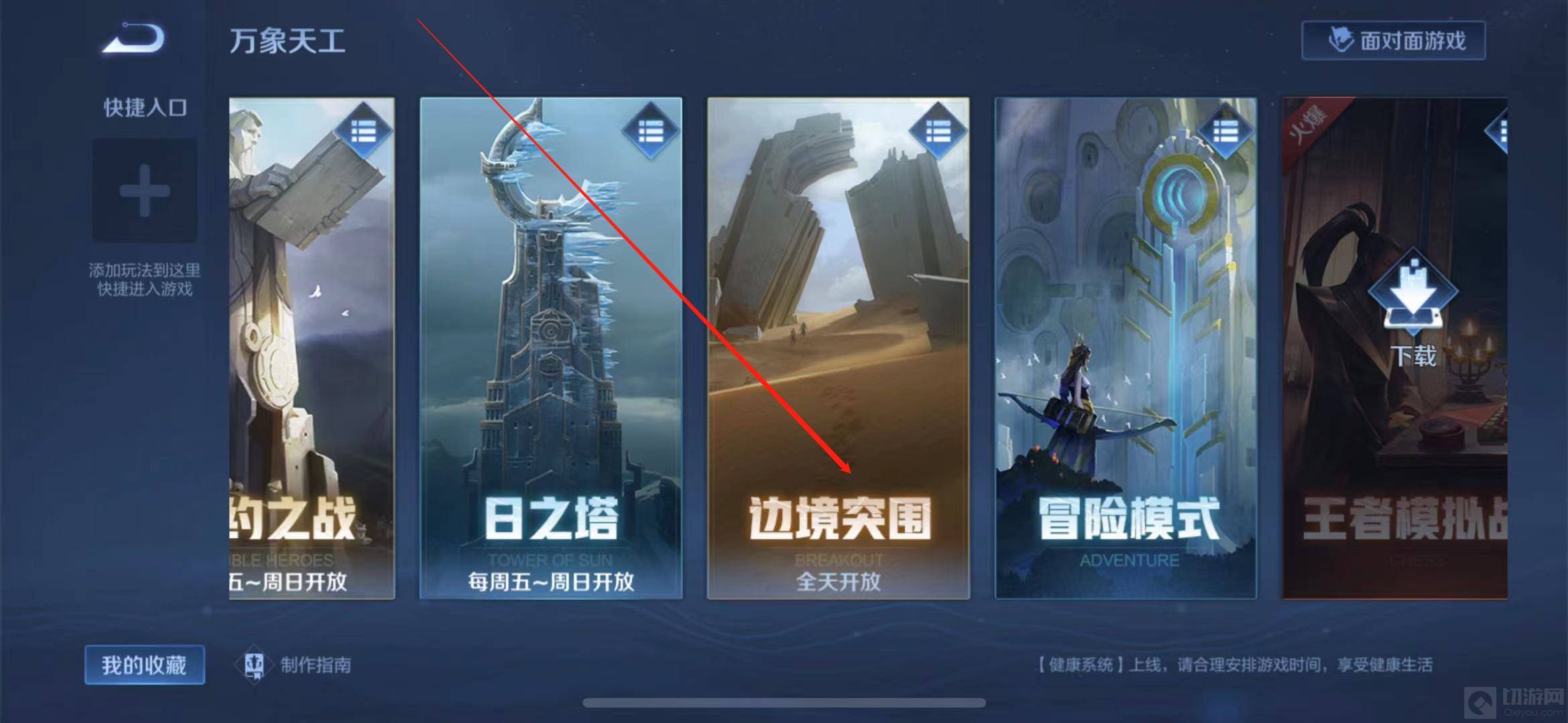 1,首先打开游戏,在游戏大厅进入万象天工点击边境突围。