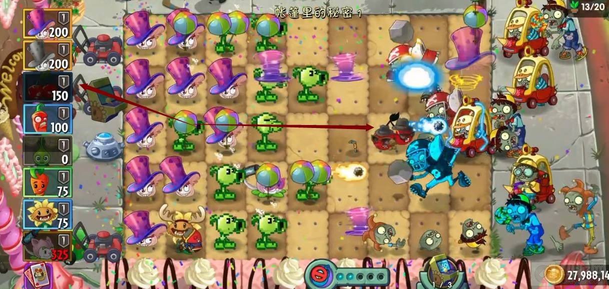3、在后排种上疯帽菇,疯狂攻击僵尸。