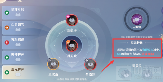 讲到梦诛两位长生仙友的搭配使用,这里我们要先说一下全新羁绊——混元护体,如果同时拥有鱼南翔、鱼北游、萱娘子、月无缺,即可解锁羁绊,每回合受到第一次物理攻击减少25%伤害,大大提升了场上灵兽的存活能力。