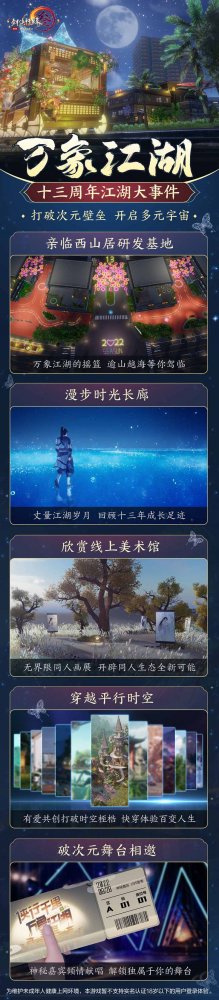 联入虚拟时空,打破次元壁垒,开启多元宇宙,在大唐江湖梦的起源之地西山居大楼共襄盛宴!侠士们从四方而来,逾山越海,相聚在这万象江湖的摇篮,不但能够携手漫步时光长廊,丈量江湖岁月,回顾十三年成长足迹,还可以无界限欣赏有爱共创,在同人画展里开辟全新可能,在平行时空中体验百变人生!值得一提的是,园区里的破次元舞台已经准备好了专属节目,猜猜将会解锁出哪位嘉宾倾情献唱呢?超多精彩让你意想不到,期待在8月28日晚与你相约此间江湖,不见不散!