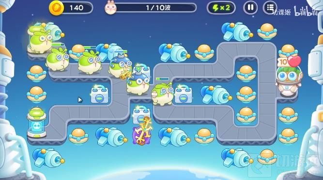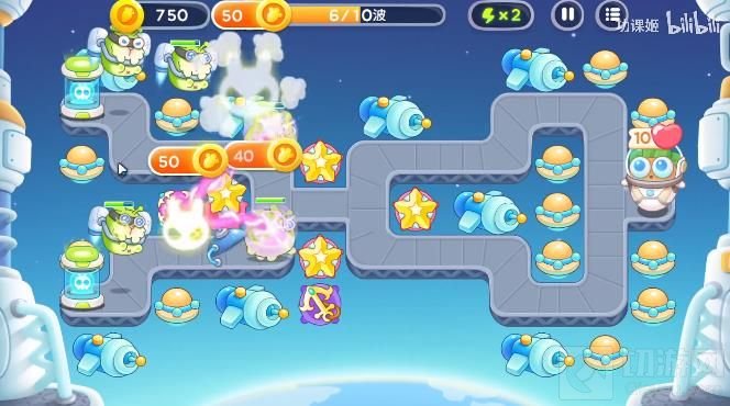 2、中期的时候添加星星塔和电磁炮,互相配合消灭敌人。
