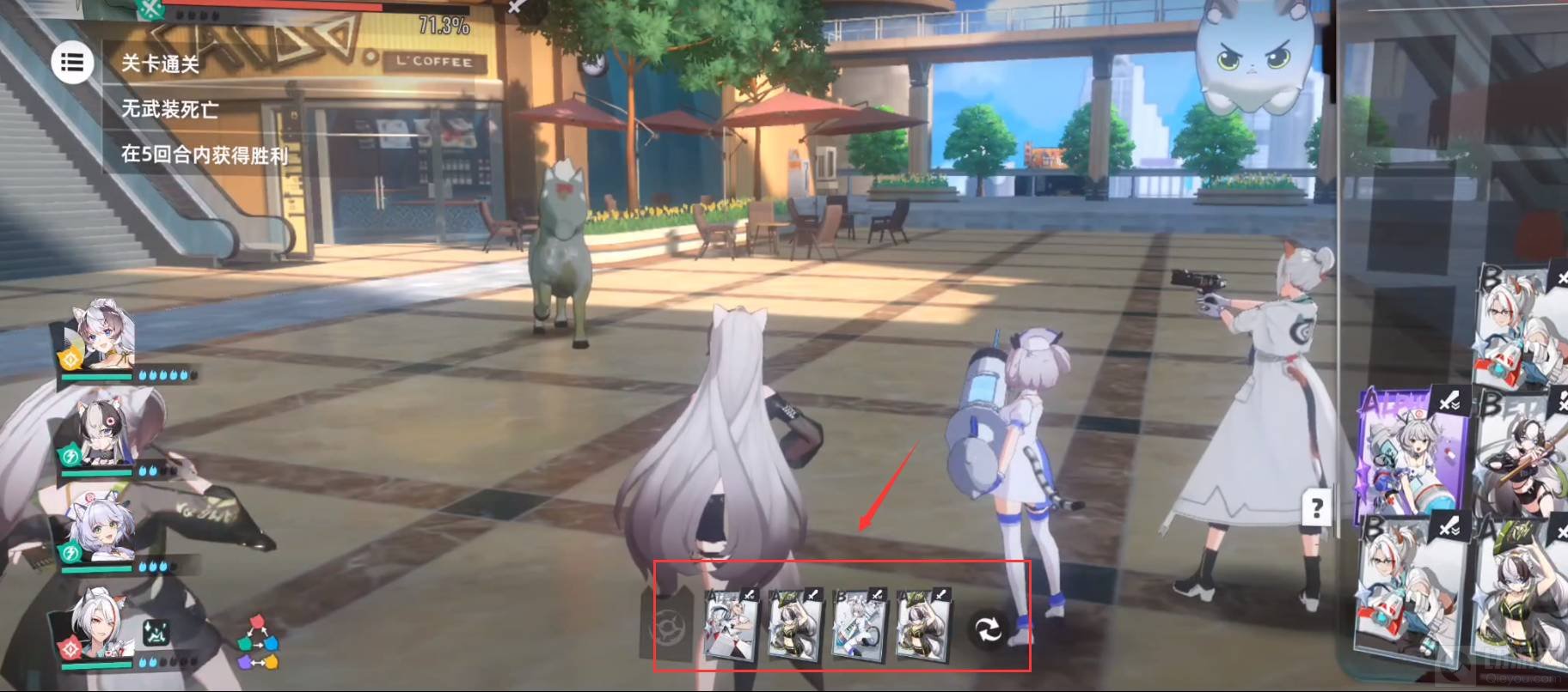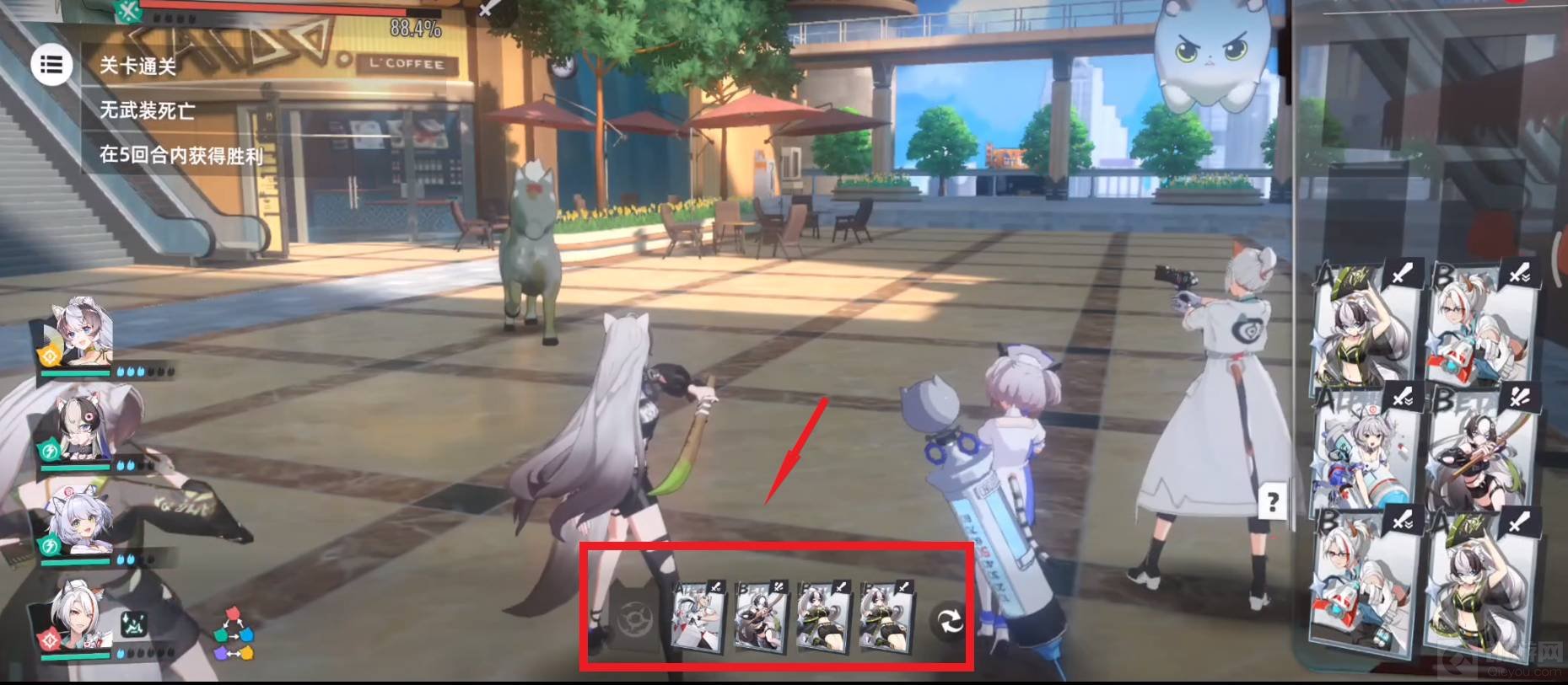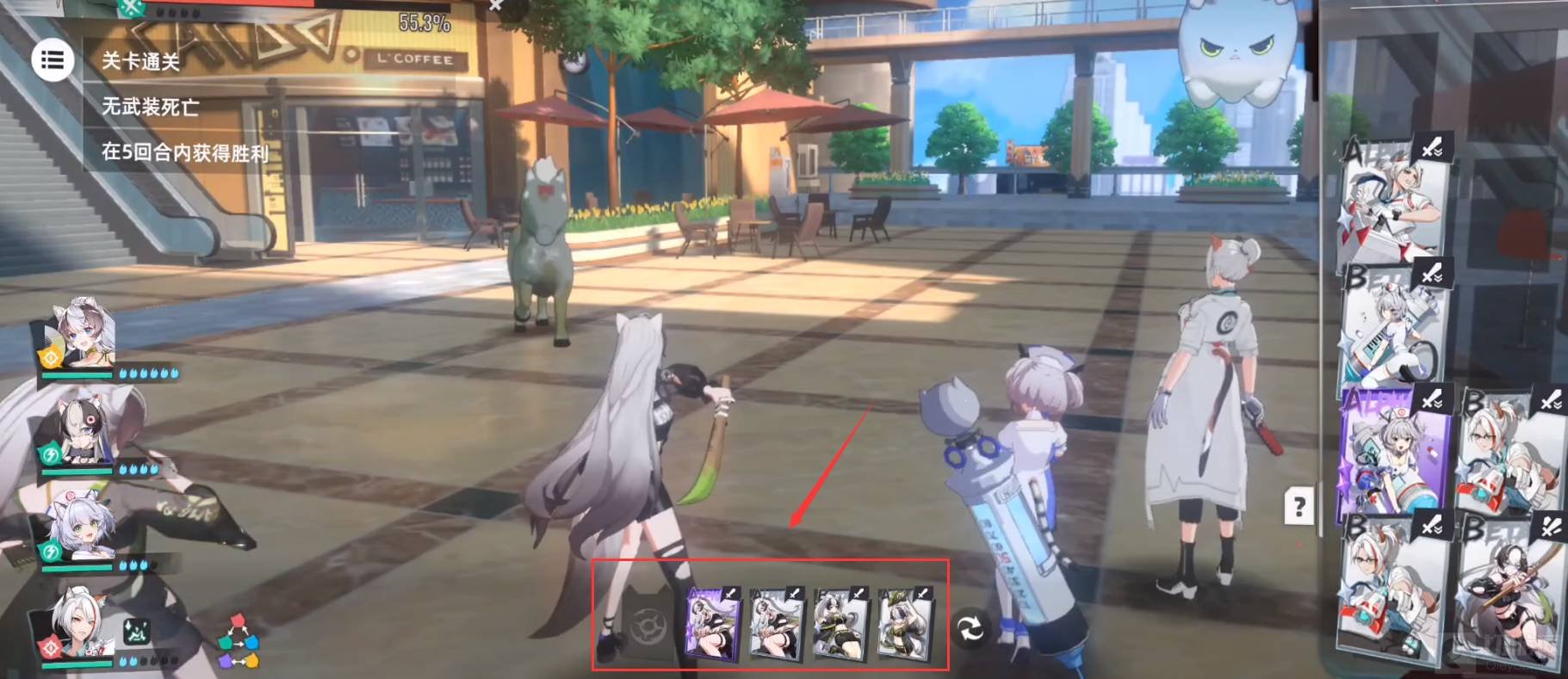 5.第五回合:红色箭头所指,该回合甜食守卫和幽篁月韵的能量集满,可以释放大招。因此先用甜食守卫的大招,再用幽篁月韵的大招,将伤害打满,其次用夜间执勤的重分解液打出易伤效果,最后再用甜食守卫的刹那收尾击败boss。