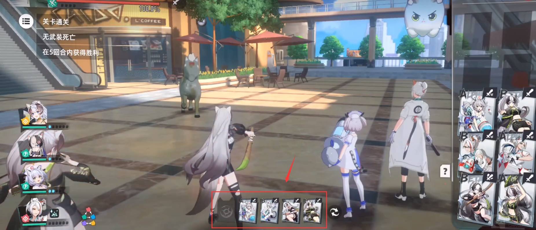 1.第一回合:红色箭头所指,先用妄想注射溶解注射,打出boss的易伤状态,再用妄想注射的疗愈针剂。其次再用甜食守卫的瞬身,最后用幽篁月韵的灵风骤生打出烈风效果持续造成伤害。