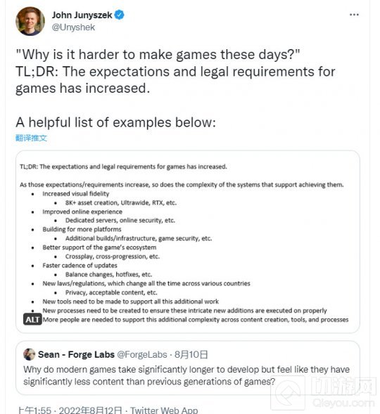 最近油管频道Forge Labs的Sean发推,询问为什么现代游戏开发比之前更长了,但感觉内容却比之前世代的游戏少了很多。这个问题吸引了343高级社区经理John Junyszek。他回复说:“为什么现在做游戏越来越难了?一句话:因为现代游戏的预期和法律要求都升高了。下面是一些有帮助性的例子。”