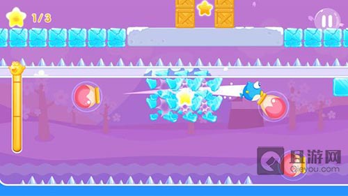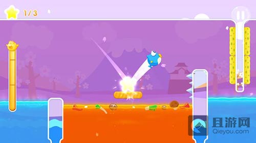 玩家在游戏过程中,需要学会借力使力,每一处的机关都要合理地运用,就能巧妙的将阻力变为助力,帮助你成功解谜闯关。而随着关卡一关一关的解开,后期游戏难度逐步加强,也增添了更多玩法,如游戏截图所显示的角色能量条。小鱼飞飞离开水面进行冲刺时每次会消耗一定的能量条,能量条完全消失是无法再行动的。但画面中的水池是可以为小鱼迅速补充能量,让小鱼瞬间充满活力并可再次进行更进一步的冲刺。
