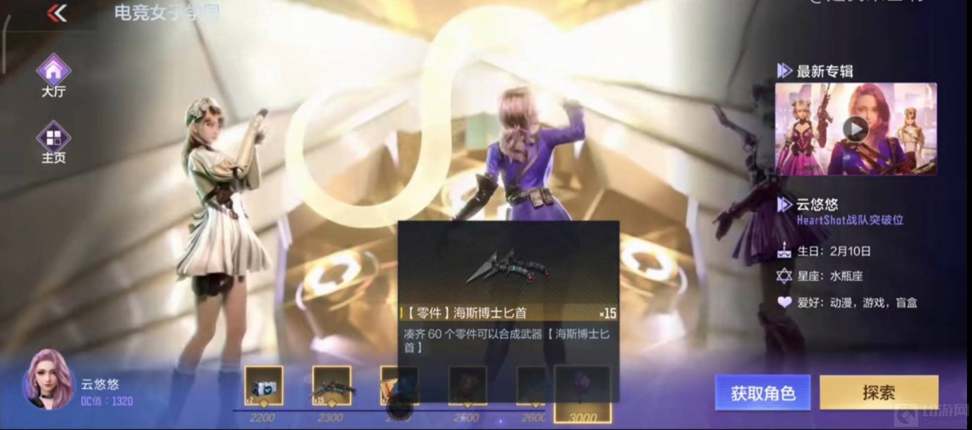 在电竞女子学院中通过完成云悠悠相关的剧情,增加和云悠悠的DC值,从而获得海斯博士匕首的碎片,集齐60个匕首碎片后就能合成海斯博士匕首,然后觉醒这把匕首就可以获得海斯博士双刃啦。