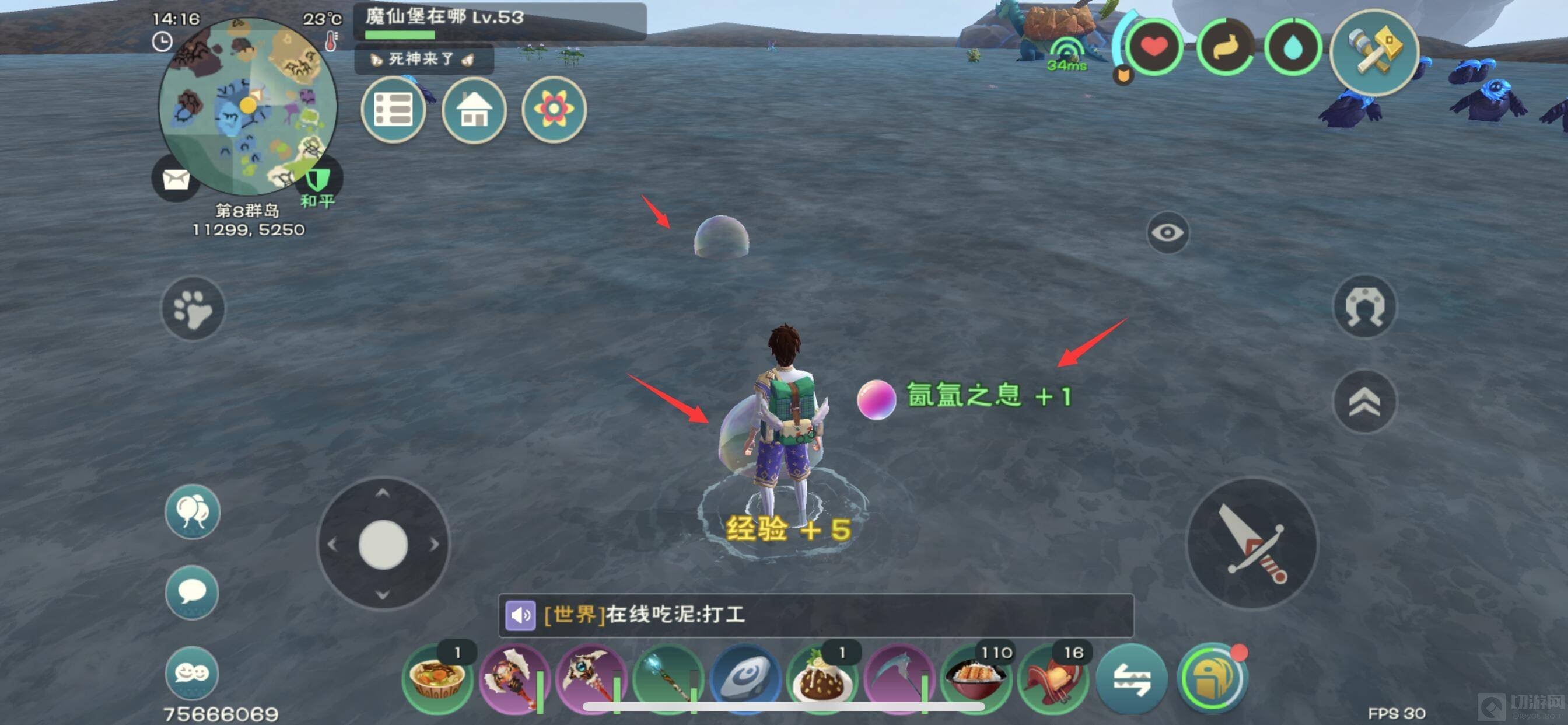 2、在龙树岛中间的水岛中也遍布着很多氤氲之息,图下这中彩色泡泡就是,一般一处都是2-3个,隔不远就又有2-3个,属于很常见的一种材料,在沉眠之海海底下最多氤氲之息。