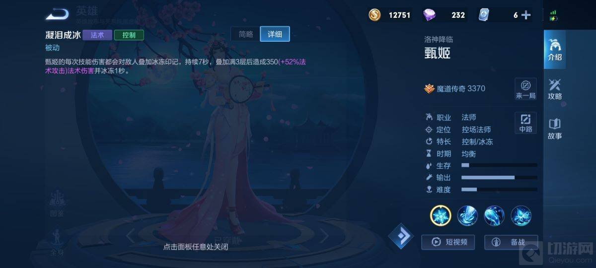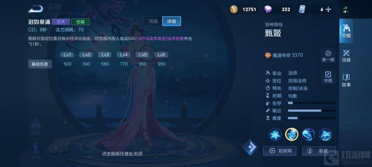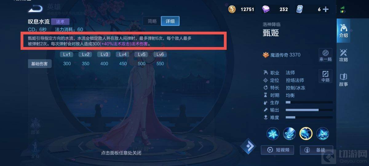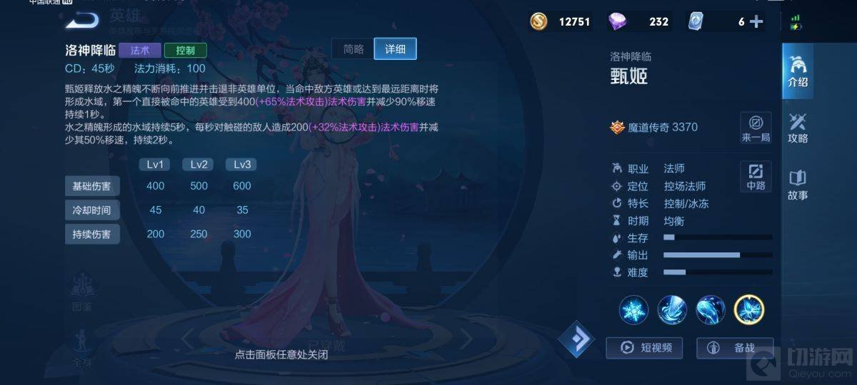 1、甄姬是控制型的法师英雄,起手二技能叹息水流可以多次弹射,能加快甄姬的消耗能力。