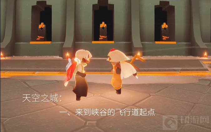 1.天空之城在霞谷飞行道的上空,先来到飞行道的起点,两人背背向上飞行。