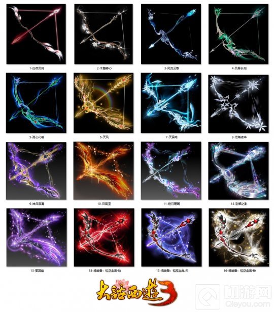 苍风的武器是近一人高的长弓,如一轮细细的新月挂在身后。在游戏中,也会有各色各样的弓箭武器。