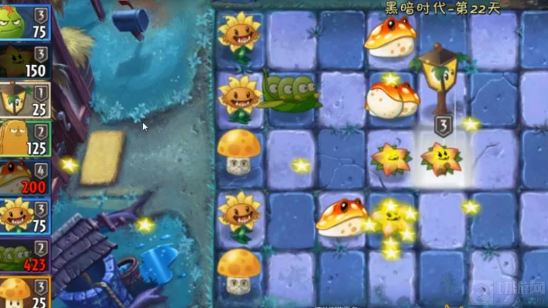 2、逐步种上攻击植物,抵御僵尸攻击,金蟾菇还会吃掉墓碑,多种几个金蟾菇,就可以更快吃掉僵尸了。
