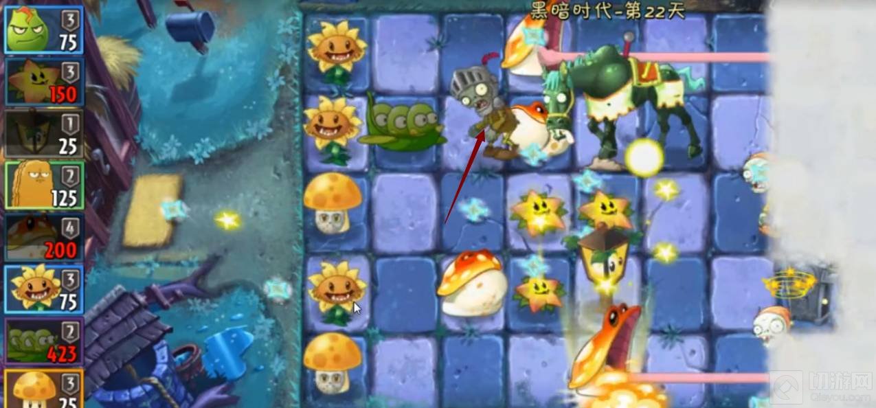 3、等待骑士僵尸出现,骑士僵尸受到伤害以后,自己下马,然后就会被金蟾菇一口吃掉了。
